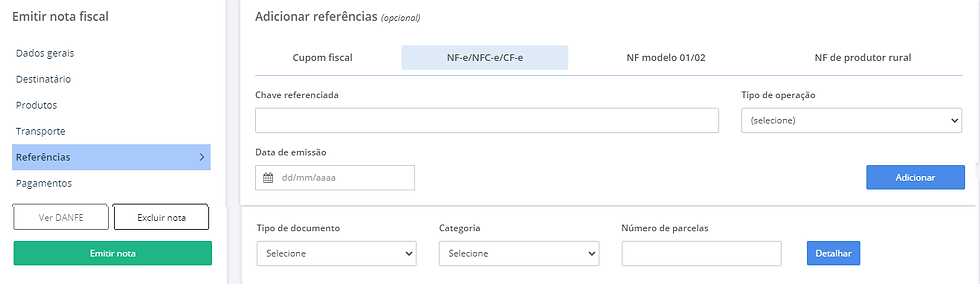 No menu de referências, coloque a chave da nf referente aos produtos devolvidos